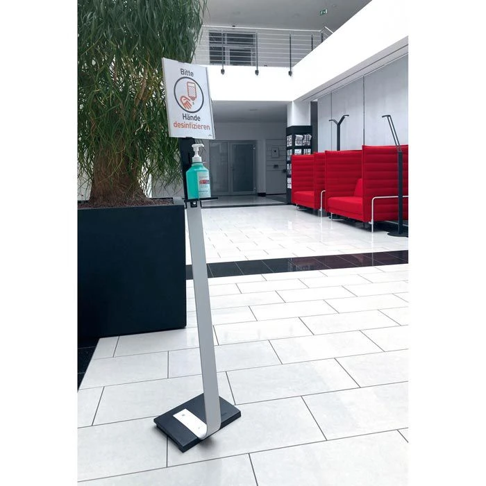 sonstiges: Aufnahme für Desinfektionsmittelspender bis 88 x 88 x 215 mm (250 ml bis 750 ml), Aluminium-Profil mit Acrylschild, Ausrichtung im Hoch- und Querformat möglich, schwerer Gussfuß mit gummierten Pads